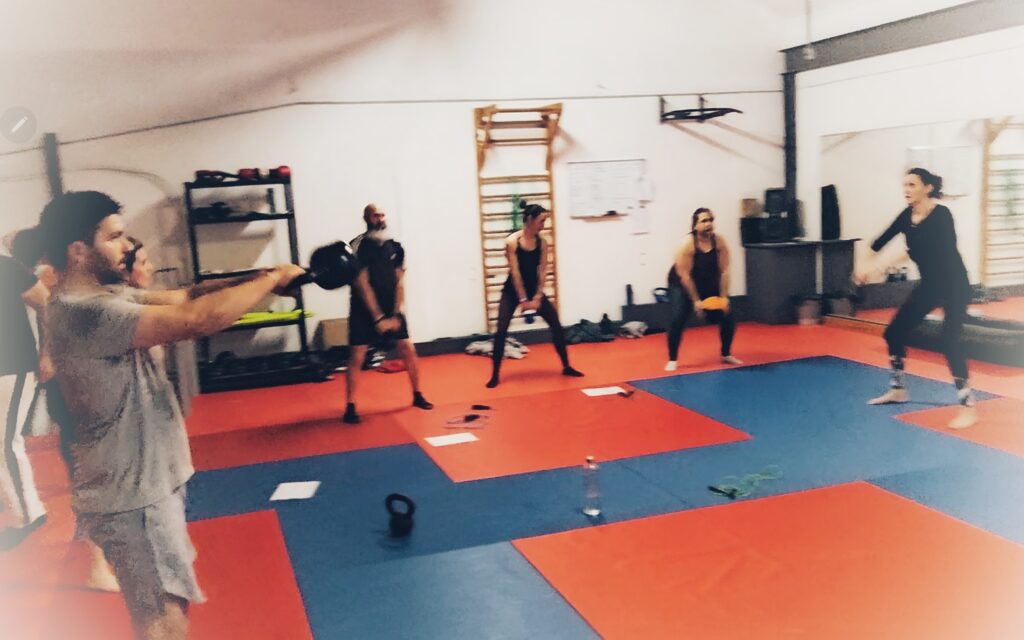 Pour le training : kettlebell, medecines ball, battle rope, barre de traction, coussin d’équilibre, cordes à sauter, les dés magiques de Manu!!