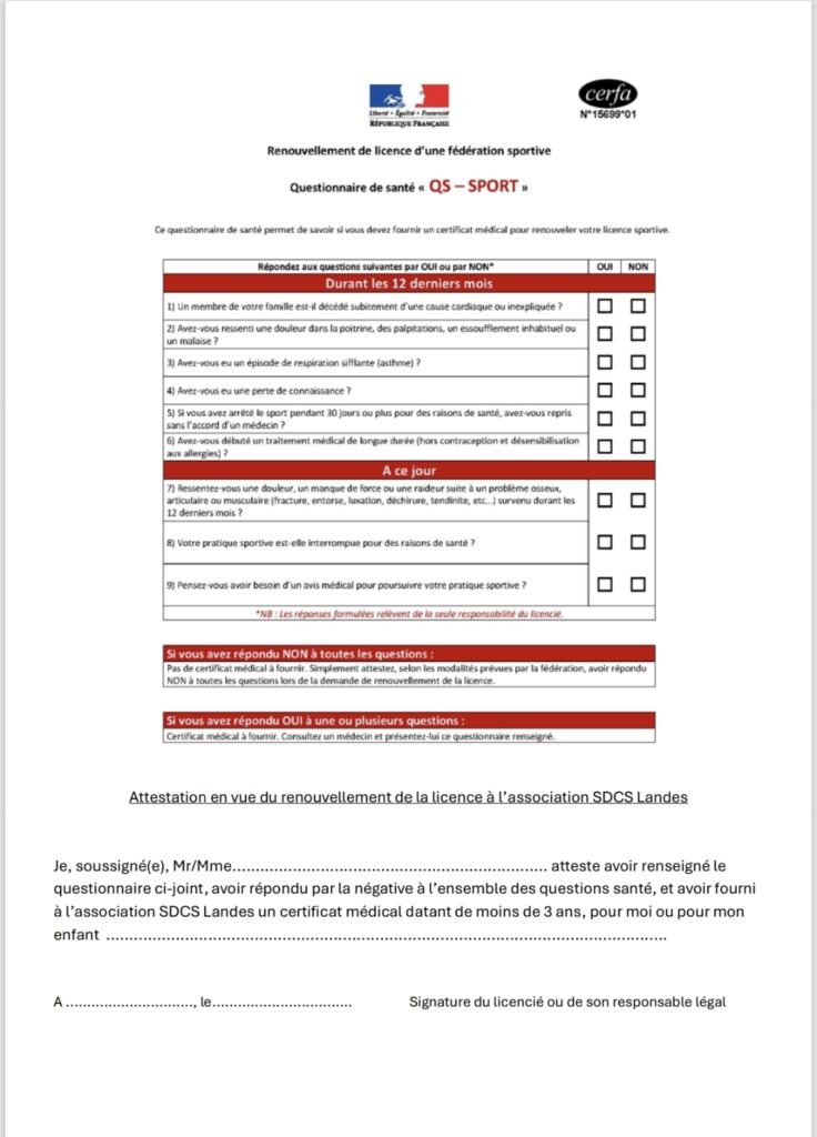 Un dossier complet avec certificat médical sera demandé avant toute demande de licence auprès de la fédération. Votre certificat médical sera ensuite valable durant 3 ans dans notre association.
